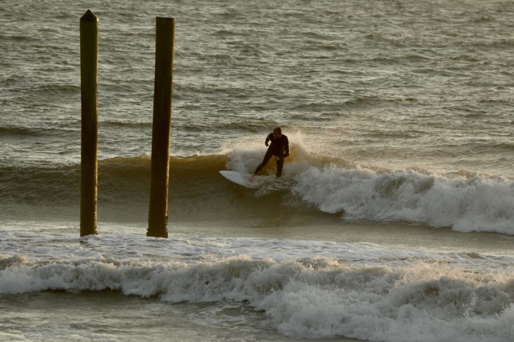 As most of you know, the former Poles were removed, [a few years ago] by the angry sea. The 2016 and 2017 Hurricanes, Matthew and Irma did most of the damage. At this time they are being rebuilt by the Federal Government, Naval Station Mayport. For your own safety, the job site manager ask for surfers, swimmers, or foot traffic keep out of the construction area.