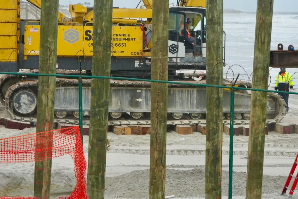 As most of you know, the former Poles were removed, [a few years ago] by the angry sea. The 2016 and 2017 Hurricanes, Matthew and Irma did most of the damage. At this time they are being rebuilt by the Federal Government, Naval Station Mayport. For your own safety, the job site manager ask for surfers, swimmers, or foot traffic keep out of the construction area.
