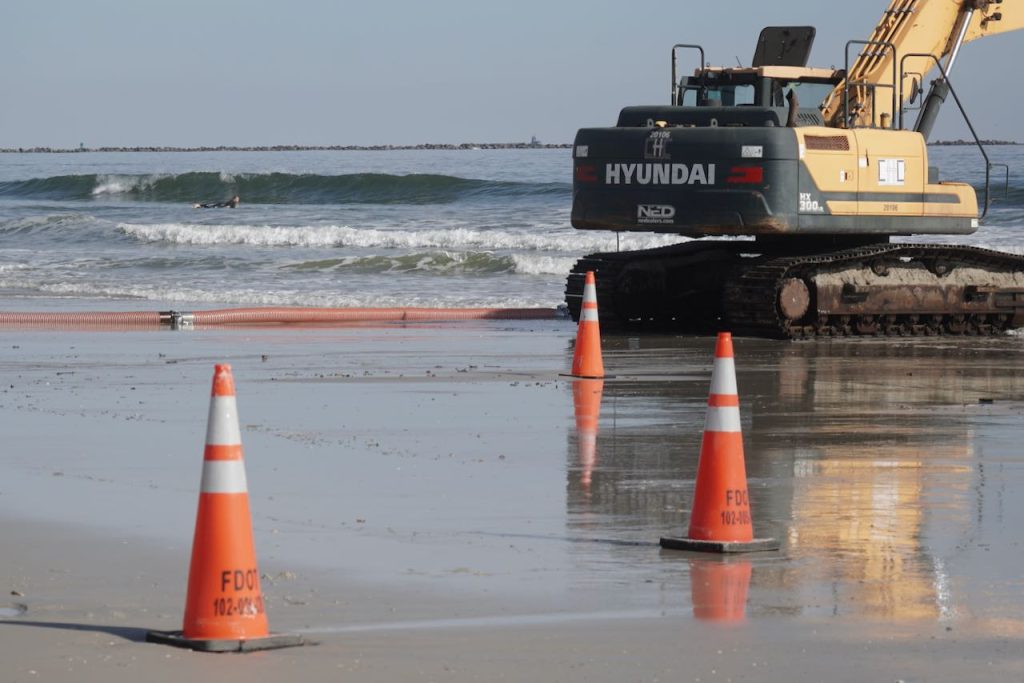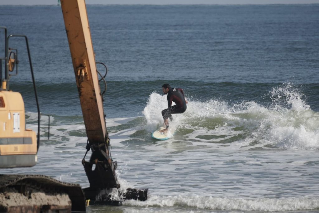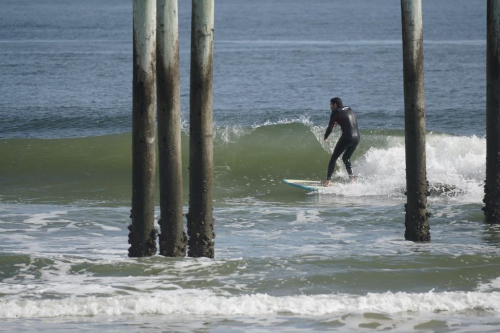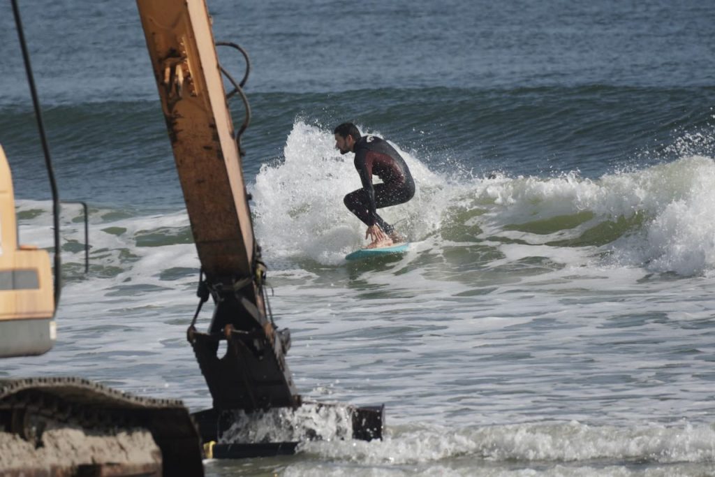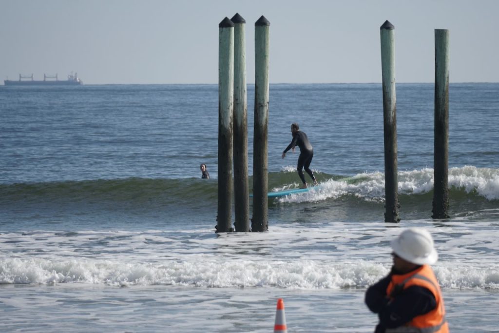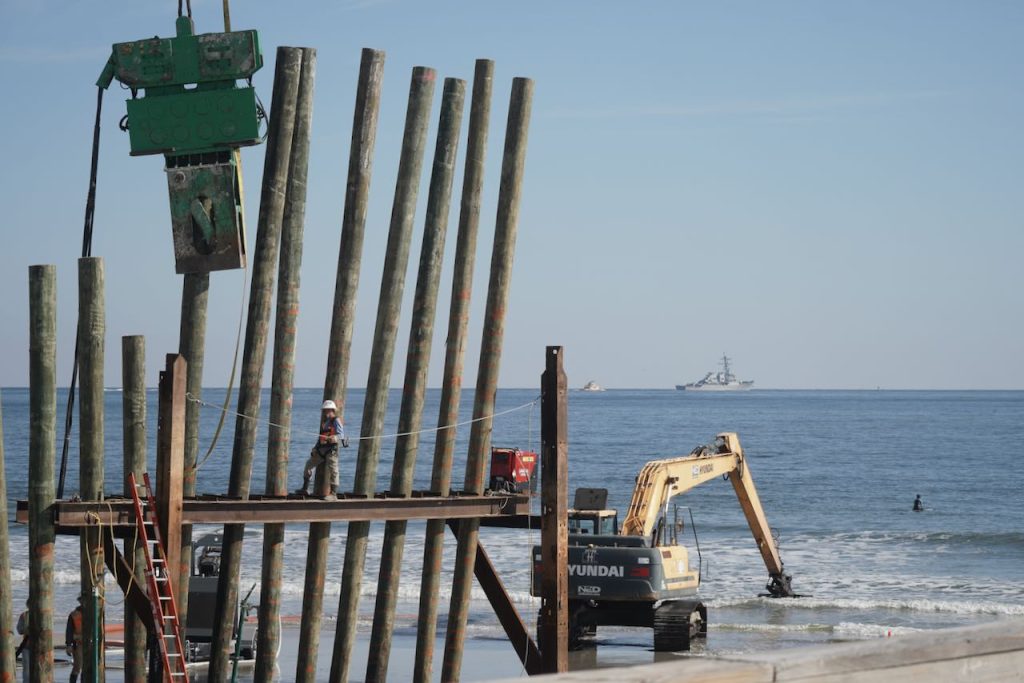 As most of you know, the former Poles were removed, [a few years ago] by the angry sea. The 2016 and 2017 Hurricanes, Matthew and Irma did most of the damage. At this time they are being rebuilt by the Federal Government, Naval Station Mayport. For your own safety, the job site manager ask for surfers, swimmers, or foot traffic keep out of the construction area.
